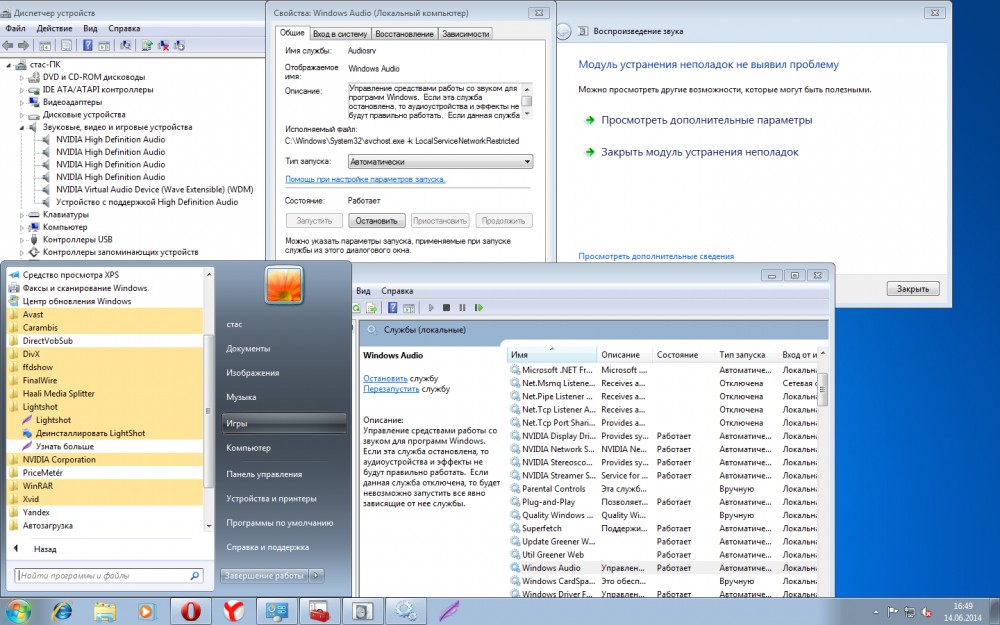 1) По скриншоту не видно что Вы ось переустанавливали. Также не видно где Вы проверяете работоспособность звуковой карты. Где окно *Свойства:....*.
