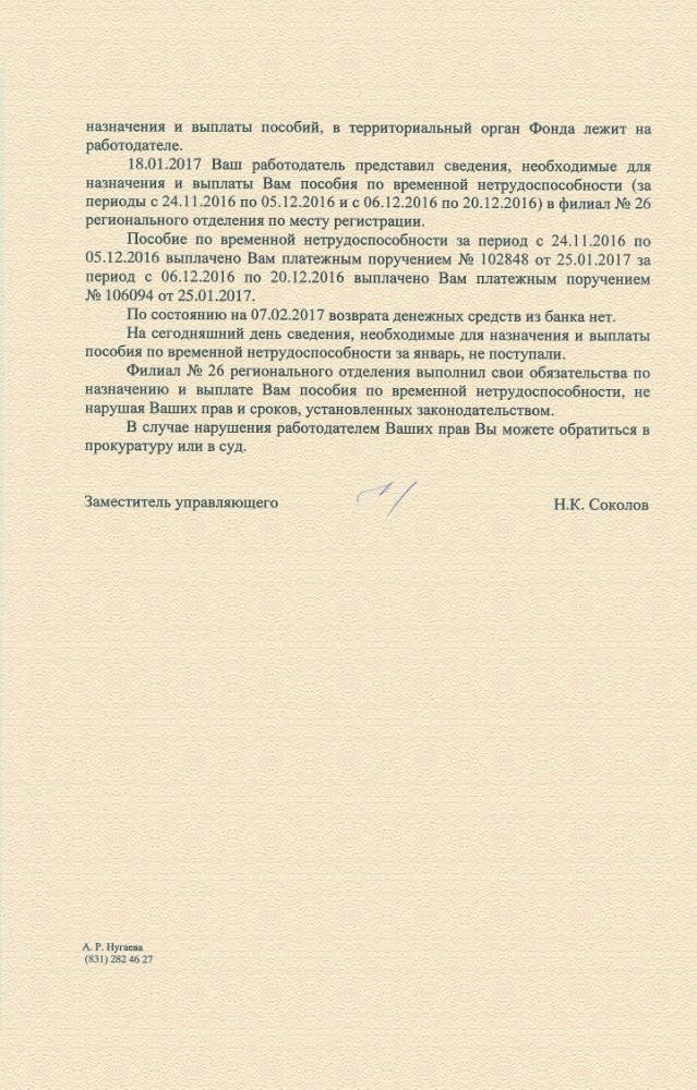 | Marina, можете выложить эту самую отписку на двух листах? Если больничный продлевается, то по следующему первые три дня оплачивает ФСС, однако по первому должны были. И еще, если говорите, что с перерывами, то зарплату за дни, на которые выходили вам тоже не выплатили?