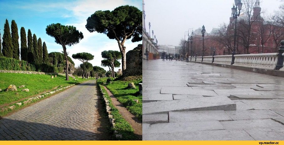 | Слева - Аппиева дорога в Риме. Камни уложены при Аппии Клавдии в 312 году до н.э. Справа - плитка у Кремля, уложена в 2016-м.