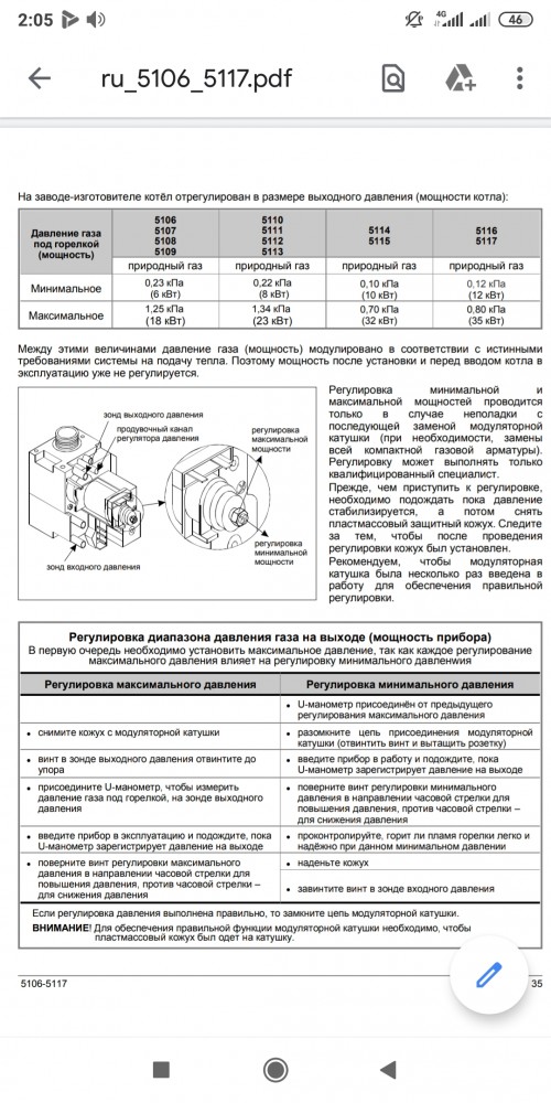 По этому поводу интересуют два вопроса: Какое у нас в бытовой газовой сети давление (поскольку рабочее у котла 1,3 - 2,0 МПа)? Поможет ли регулировка диапазона давления газа на выходе (сама процедура на фото) и кто может сделать? Жаль Кот Котельный нас преждевременно покинул, очень бы пригодилась его консультация. |