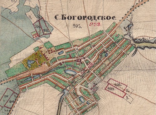 Чтобы было наглядное представление, публикуем фрагмент карты с селом Богородским 1850 года (его в полном объеме можно найти в интернете) и межевое описание села Богородского[6], составленное уже после смерти С.В. Шереметева (1866), когда в права наследника вступил его племянник В.П. Шереметев.