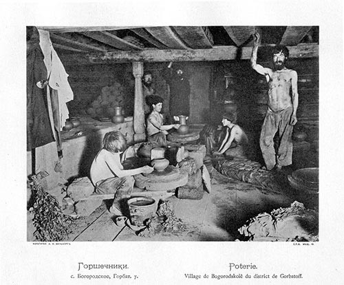 Фото помещено в монографии "Кустарные промыслы Нижегородской губернии второй половины XIX - начала XX вв.", соавтором которой является С.В. Петряев. Поучаствовал и я. Правда, наши замечания по с. Богородскому учтены не были. Там (с. 69-70) о гончарном промысле в с. Богородском сказано так: "...Благодаря особо благоприятным условиям развития крестьянских промыслов в с. Богородском даже в отраслях, традиционно принадлежащих к сфере мелкого производства, проявлялась концентрация. Например, гончарный промысел, повсеместно имевший форму мелкого производства, здесь далеко вышел за его пределы. "Богородские гончарные заведения отличаются величиной от других, – говорилось в материалах Комиссии по исследованию кустарной промышленности... Это, скорее, маленькие фабрики, которые иногда даже трудно отнести к кустарным, особенно в том случае, если на заведения работают 15 мастеров: здесь нет ни одного заведения, в котором работал бы только один хозяин; каждое заведение составляет здание, отдельное от жилого помещения"...