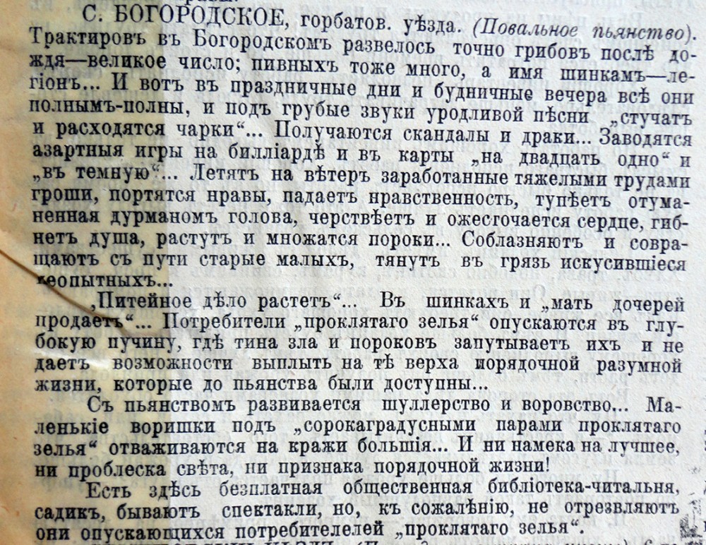 Явно заказная статейка .Написанная язвенником( в правильном понимании этого слова) по заказу трезвенника (типа Е К Лигачев) Стало завидно как живут наши деды и прадеды. Все достопримечательности БГ как раз в это время и построены. О чем писал вождь мирового пролетариата В И Ульянов(Ленин) в статье "Развитие капитализма в России" Картины(копии известных художников)изъятые из этих трактиров еще лет 70 украшали баню, парикмахерскую, а чучело медведя-шк№3