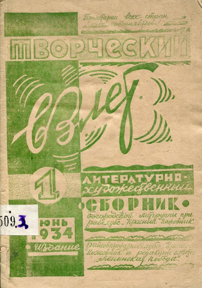 В июне 1934 г. литературная группа при рабочем клубе "Красный кожевник" города Богородска Горьковского края благодаря поддержке райсовпрофа клуба и редакции газеты "Ленинская победа" выпустила свой первый, к сожалению, оставшийся единственным литературно-художественный сборник "Творческий взлет".