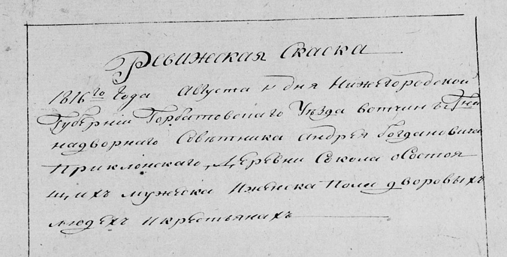 Иван Прокофьев 75 лет, у него детей Афонасей 45, Василий 35, Василий же 32. У большова Василя сын Петр 5, у меньшова Василя детей Семен 9, Алексей 8. У него ж Ивана внук Михайло 7, Тихон 5, Иван полугоду Семеновы дети. У него ж племянник родной Михайло Федоров 53 лет, а у свидетельства явился сосед, а не племянник у него детей Иван 36, Андрей 32, Степан 30 лет. У Ивана детей Иван 9, Яким 4, Алексей году.