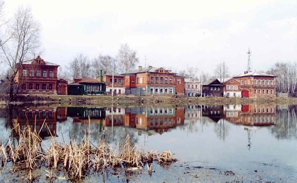 (Усадьба А. Солодовникова, 1894 г. (Ул. Серп и Молот, 16, 18). Объект культурного наследия регионального значения. В составе этой усадьбы выделяется трехэтажный производственный флигель (на первом плане). Производственные постройки имелись практически во всех усадьбах села)
