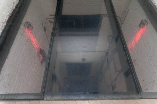 В Москве в здании Digital October (фабрика Красный октябрь) перед входом в туалет открывается вот такой вот вид. Проходишь по стеклу, а внизу глубокая шахта. Выглядит прикольно.