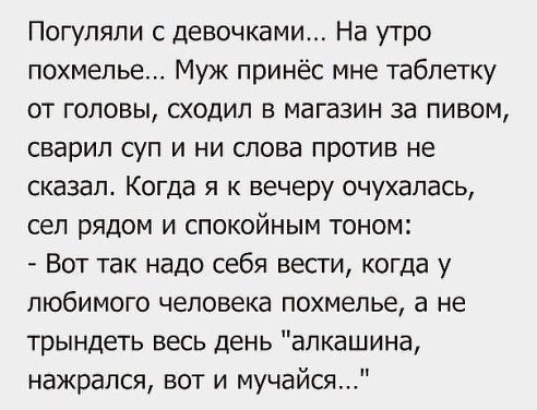 Я ей говорю, мол, сама понимаешь, трудно так долго без женщины, не удержался, но больше ни-ни, клянусь, а она – к холодильнику. А я ж доесть ничего не успел, что наготовил, думал, завтра успею. И вот на тебе – и борщ, и плов, и два раза по пол-пирога. Спалился, короче, по полной. |