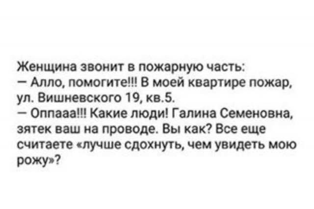 Барышня сильно разозлилась и из-за ревности начала по очереди звонить этим номерам, чтобы узнать, кого скрыл под этими названиями её романтик. Оказалось, что номер "Нежные прикосновения" - это его мама, номер "Милые слезинки" - его сестра. А когда она позвонила на номер «Госпожа моих снов», зазвонил её телефон. Женщина заплакала от угрызений совести, потому что так несправедливо подумала про своего мужа, а потом сняла со счёта все свои деньги и подарила их мужу. Когда она рассказала об этом его маме, мама пошла и купила ему золотые часы. Когда об этом узнала его сестра, она подарила брату мотоцикл. Муж очень растрогался от такого отношения и даже немного всплакнул. А потом надел часы, взял бабки, сел на мотоцикл и поехал е..бать "Электрика Алексея". |