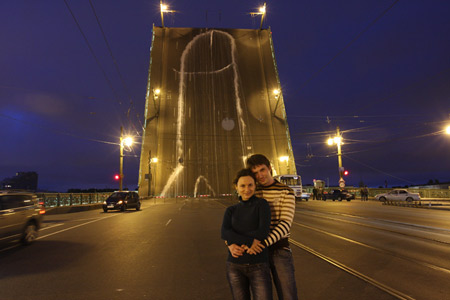 скрытый текст Ночью 14 июня в Петербурге активисты группы «Война», похоже, главного теперь поставщика оригинального контента и шума в русскоязычную блогосферу (если не считать несогласных), белой краской нарисовали на Литейном мосту 65-метровый член . Когда разводной мост начал подниматься, член, угрожающе эрегируя, встал прямо напротив здания ФСБ. «Таким образом, художники приготовили всем сотрудникам Федеральной Службы Опасности стартовую космическую площадку для отправки во внеземные цивилизации», — пишет один из организаторов акции, выпускник философского факультета Тартуского университета, ученик Ю. М. ЛотманаМолодые люди фотографируются на фоне стихийной достопримечательности Петербурга. ----------