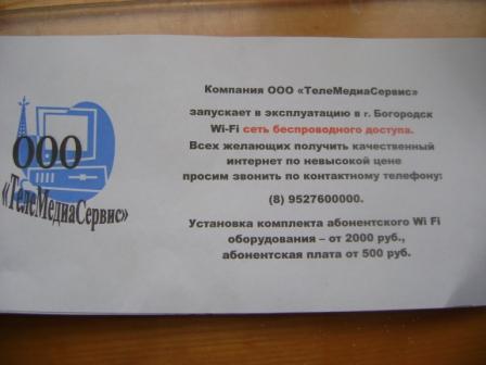 | В почтовом ящике нашел объявление ООО "ТелеМедиаСервис" запускает в эксплуатацию в г Богородске WI-FI сеть беспроводного доступа.Установка комплекта абонентского WI-FI оборудования от 2000р,абонентская плата от 500р Такое возможно?
