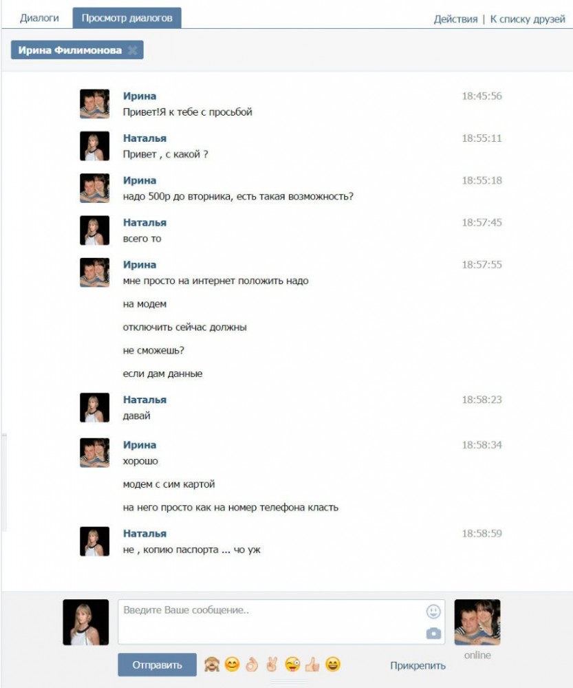 Д-Привет, поможешь мне? Я-Привет! ??? Д-Положишь мне денег на модем? Тут я начинаю думать, что мой подруг не должен бы, вроде, просить меня о таких вещах. Начинаю подыгрывать и проверять его. Я-Сколько надо? А-то на карточке осталось только 4300. (Думаю, хватит ли совести запросить много) Д-600рублей. Я- куда закинуть? Д-9600604194 сюда Проверил номер. Номер совершенно другой. Продолжил подыгрывать. Сообщил хозяину аккаунта. Я-закинул. Пришли? Д-нет! Я-сегодня проблемы с нашим банком, на телефон пол дня приходили. Как сынок? (У друга детей нет) Ну далее хозяин аккаунта взял все в свои руки. Не попадайтесь! ----------
