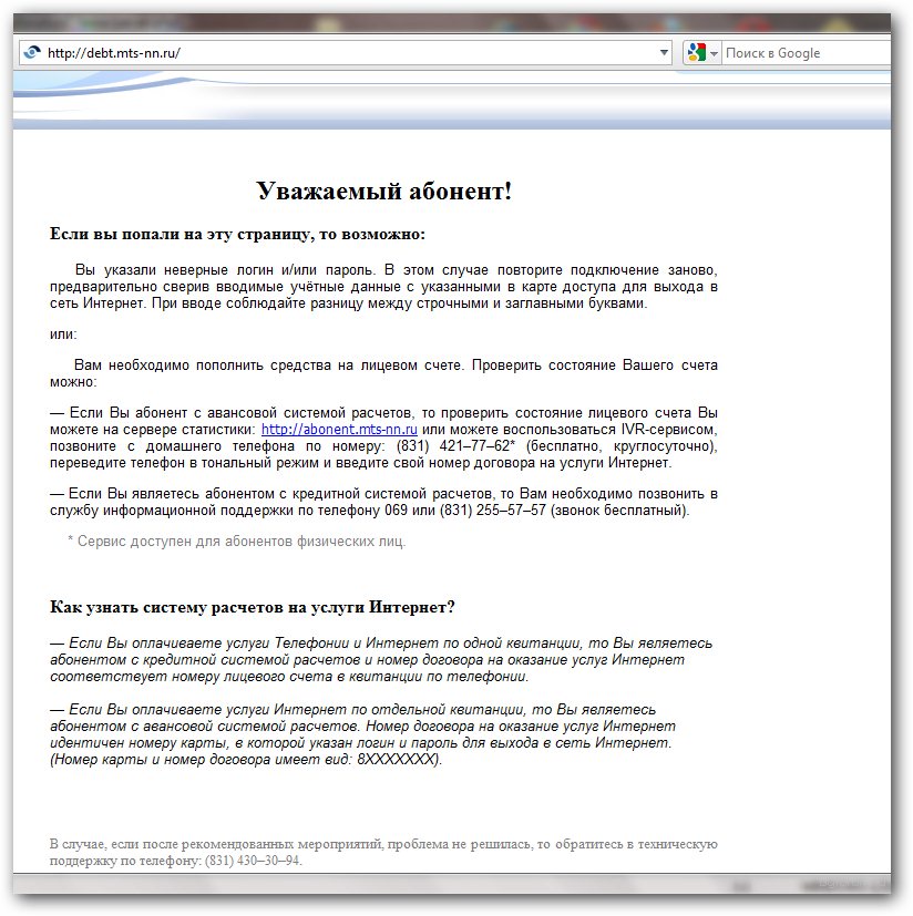 В последнее время пару раз натыкался на странную вещь. Инет начинает жутко тормозить, перезагружаю модем и при заходе на любой сайт появляется следующая страница (на скриншоте). Инет оплачен, задолженности нет, пароль и логин указаны верно. Спасает либо еще одна перезагрузка модема, либо долгое его выключение.
