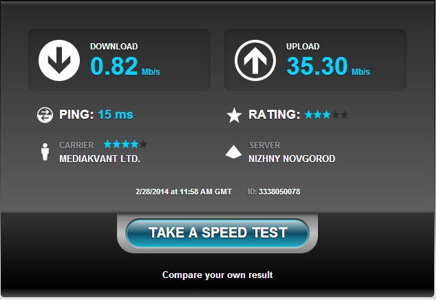 Подключили интернет от них - результаты удручающие. Вот результат простого пинга до google.com скрытый текст mtur-bog ~ # ping google.com PING google.com (173.194.32.168) 56(84) bytes of data. 64 bytes from 173.194.32.168: icmp_seq=1 ttl=57 time=25.6 ms 64 bytes from 173.194.32.168: icmp_seq=2 ttl=57 time=26.3 ms 64 bytes from 173.194.32.168: icmp_seq=3 ttl=57 time=25.7 ms 64 bytes from 173.194.32.168: icmp_seq=4 ttl=57 time=25.5 ms 64 bytes from 173.194.32.168: icmp_seq=5 ttl=57 time=25.8 ms 64 bytes from 173.194.32.168: icmp_seq=6 ttl=57 time=25.4 ms ^C --- google.com ping statistics --- 6 packets transmitted, 6 received, 0% packet loss, time 5265ms rtt min/avg/max/mdev = 25.481/25.751/26.317/0.305 ms А вот как должно быть у более-менее нормального провайдера скрытый текст Astra-nn ~ # ping google.com PING google.com (188.234.130.245) 56(84) bytes of data. 64 bytes from net130.234.188-245.ertelecom.ru (188.234.130.245): icmp_seq=1 ttl=61 time=0.451 ms 64 bytes from net130.234.188-245.ertelecom.ru (188.234.130.245): icmp_seq=2 ttl=61 time=0.458 ms 64 bytes from net130.234.188-245.ertelecom.ru (188.234.130.245): icmp_seq=3 ttl=61 time=0.440 ms 64 bytes from net130.234.188-245.ertelecom.ru (188.234.130.245): icmp_seq=4 ttl=61 time=0.442 ms 64 bytes from net130.234.188-245.ertelecom.ru (188.234.130.245): icmp_seq=5 ttl=61 time=0.442 ms 64 bytes from net130.234.188-245.ertelecom.ru (188.234.130.245): icmp_seq=6 ttl=61 time=0.504 ms ^C --- google.com ping statistics --- 6 packets transmitted, 6 received, 0% packet loss, time 4996ms rtt min/avg/max/mdev = 0.440/0.456/0.504/0.025 ms ----------