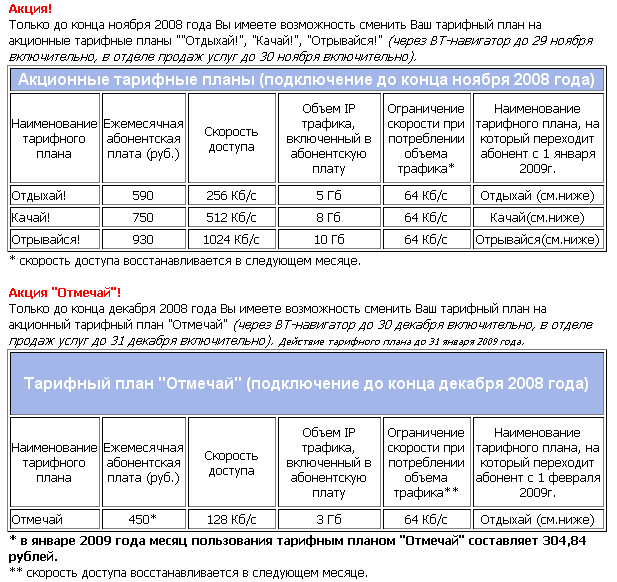 Цитата: Отмечай Новый Год вместе с «J»! Плюс к тому, в ВТ-Навигаторе появились новые тарифы, по названию схожие со старыми, но с восклицательным знаком на конце, удвоенной скоростью, увеличенным порогом траффика и 64k после его потребления вместо 32 (см. приложенный файл). В любом случае, я подал заяву в Нафигатор на переезд на "Отмечай" (три сотни лишними не бывают, жаба будет довольна ). А там будет видно. |