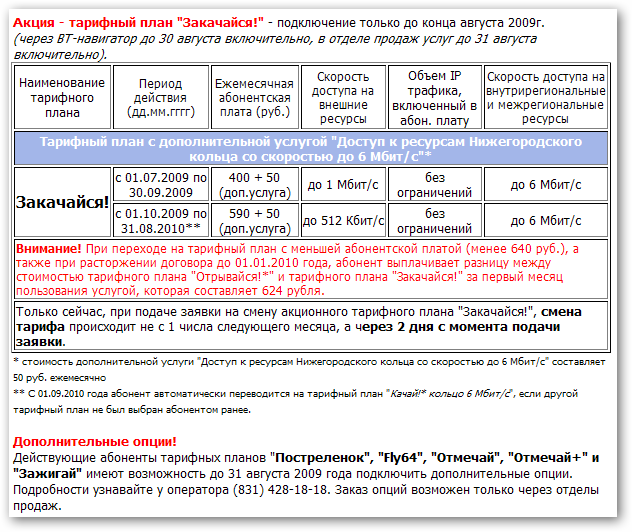 jostik, спасибо за инфу. Не знал про новые тарифы (нижегородские сайты для меня умирают). Посмотрел на этот "Закачайся!", почитал. Хороший тариф: 400 рублей за мегабит внешки и 50 рублей за 6 мегабитное кольцо (от кольца отказаться нельзя). Действует тариф с даты переключения по 1 октября. Дальше и до 2010 года будет 590 рублей за полмегабита внешки и 50 рублей за кольцо. Всех смущает только одно — в течении всего 2009 года нелья будет перейти на другой тариф с меньшей абонетской платой (говорят, к осени ВТ разродится новыми вкусными дешевыми тарифами).