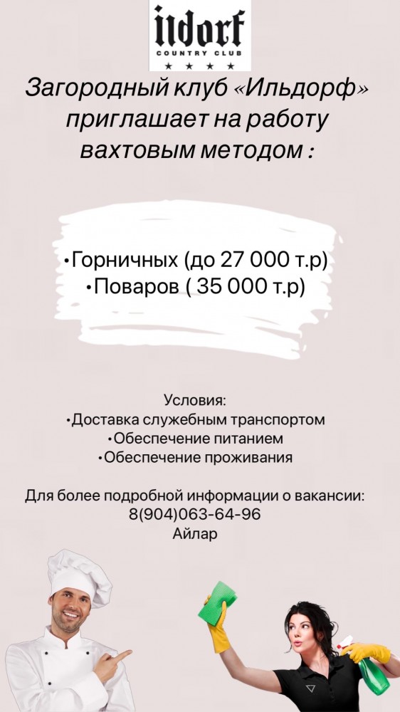| Загородный клуб "Ильдорф" приглашает на работу вахтовым методом: