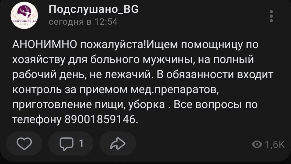 | Елена111 написал: Работа сиделка на дому. Без ночных смен. С мед.Образованием первой категории. Умею делать капельницы уколы только по назначению врача.Звоните по номеру телефона:+7 952 764 32 59 |