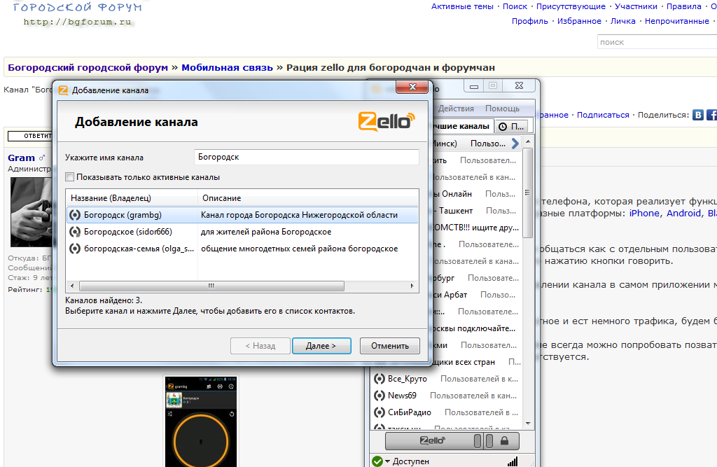 Подтягиваемся, устанавливаем приложение, регистрируемся и находим канал Богородск. Сегодня уже 7 человек присоединилось, затестили.