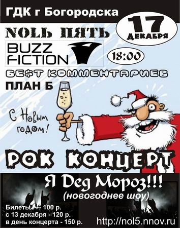 - BUZZ FICTION (Н. Новгород) - http://vkontakte.ru/club3767325 - БЕ$T КОММЕНТАРИЕВ (Павлово) - http://www.pavlovoportal.ru/forum/index.php?showforu... - ПЛАН «Б» (Богородск) - http://vkontakte.ru/club10022593 приглашают тебя на НОВОГОДНЮЮ РОК - ТУСОВКУ, где ты непременно получишь заряд адреналина, который уже 17 декабря пробудит в тебе ощущение приближающихся праздников! Тебя ждут ПОДАРКИ от Деда Мороза (кто им будет, тебе еще предстоит догадаться…), ВИДЕО-ПРОЕКЦИЯ на большом экране, а так же взрывное ШОУ от групп-участников концерта! Да ты не ошибся, читая – 17 декабря – это ПЯТНИЦА! Начало ПРАЗДНИКА в 18:00 – именно в это время двери в ГДК г. Богородска откроются для тебя и твоих друзей! Приобретайте билеты заранее! С 1 декабря их можно будет купить в кассе ГДК! Цена билета – 100 р. С 13 декабря – 120 р. В день концерта – 150 р. Надеемся, ты не из тех, кто любит пропускать все самое интересное и сидеть дома, занимаясь, каким ни будь там рутинным занятием! Если ты хочешь утолить жажду общения с друзьями, которых давно не встречал, отбросив условности, забыть на время про свою учебу или работу, окунуться с головой атмосферу драйва, позитива и хорошего настроения – тогда добро пожаловать к нам!!! P.S. помимо всего прочего, каждого ждет подарок от группы NOLЬ ПЯТЬ! | |