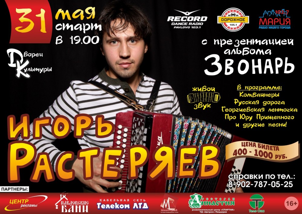 Планировал побывать на концерте Игоря Растеряева 27 апреля во Владимире, и к огромному удивлению узнаю, о его концерте в Павлово. Очень рад этой новости. Соответсвенно делюсь ею, с земляками - Богородчанами, поклонниками творчества Игоря.