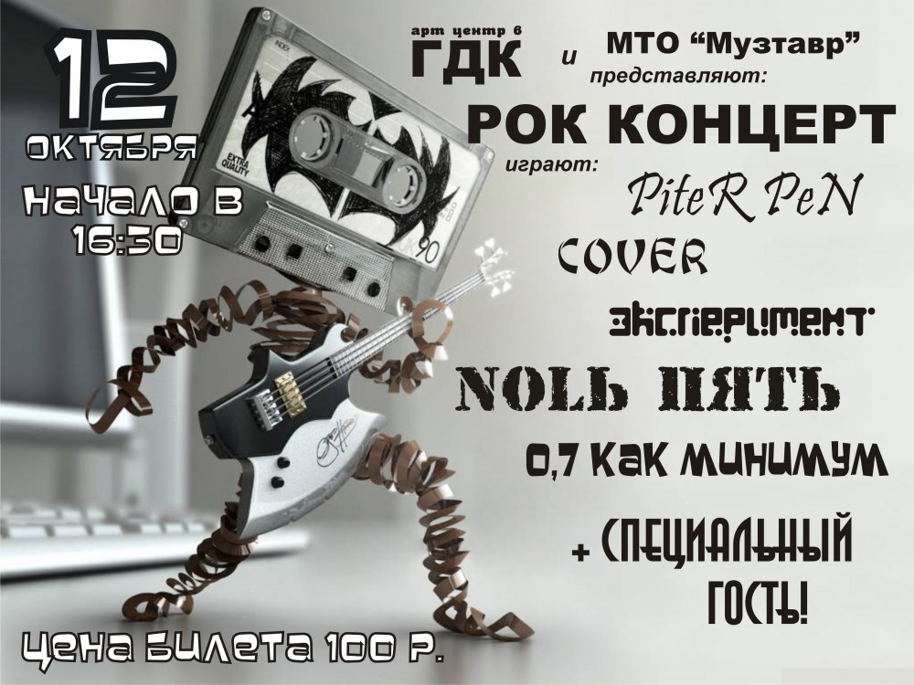 Итак откроет концерт по традиции группа «Питэр Пэн Бэнд»! Изначально коллектив планировался из двух музыкантов – гитариста и аккордеониста, но на этот раз несколько песен команды прозвучат, что называется в полном составе, т.е с барабанами басом, скрипкой и т.д. - все, как положено! Так же специально для Вас, несколько новых стихов прозвучат со сцены, так что если кому интересно, не опаздывайте! Двери будут открыты в 16:30, а концерт начнется РОВНО в 17:00!!! Группа «COVER» давненько не выступавшая в Богородске, снова в строю! Ребята подготовили более расширенную концертную программу и так же выступят в первой половине нашего фестиваля! Вашему вниманию будут представлены кавер версии песен известных рок исполнителей, как отечественной, так и зарубежной сцены!!! Группа "Эксперимент"! Очень хорошо зарекомендовавшая себя на весеннем концерте, снова исполни кавер-версии песен группы "Кино". Команда подготовила несколько новых вещей, так что ее выступление в первой половине концерта непременно создаст подобающее настроение среди слушателей! Вторую половину концерта откроет группа «NOLЬ ПЯТЬ» со своей традиционной программой. Правда, музыканты коллектива готовят кое какой сюрприз для своих слушателей, какой, пока разглашать не будем - так сказать, дождемся концерта! Вобщем, скучать с музыкантами этой команды, как всегда не придется, но поговаривают, что на этот раз особенно повезет тем, кто будет у сцены! Ну вот и началтсь сюрпризы!!! Новая богородская ретро-панк банда "0,7 КАК МИНИМУМ"! Из названия уже видно, что чего-то тут не так... Так и есть!!! Команда исполнит несколько песен с альбома "Орать и фонить", а так же некоторые "не изданные" песенки группы 05 образца 2004-2006 г.г. Если кому-то охота окунуться в безбашенную атмоферу тех лет - добро пожаловать!!! Выступит коллектив прямо перед спец гостем, интригу, кто будет таковым, решили хранить до концерта!!! В общем, мероприятие грозит быть незабываемым, так что всех ждем!!! Цена билета 100 р.) | |