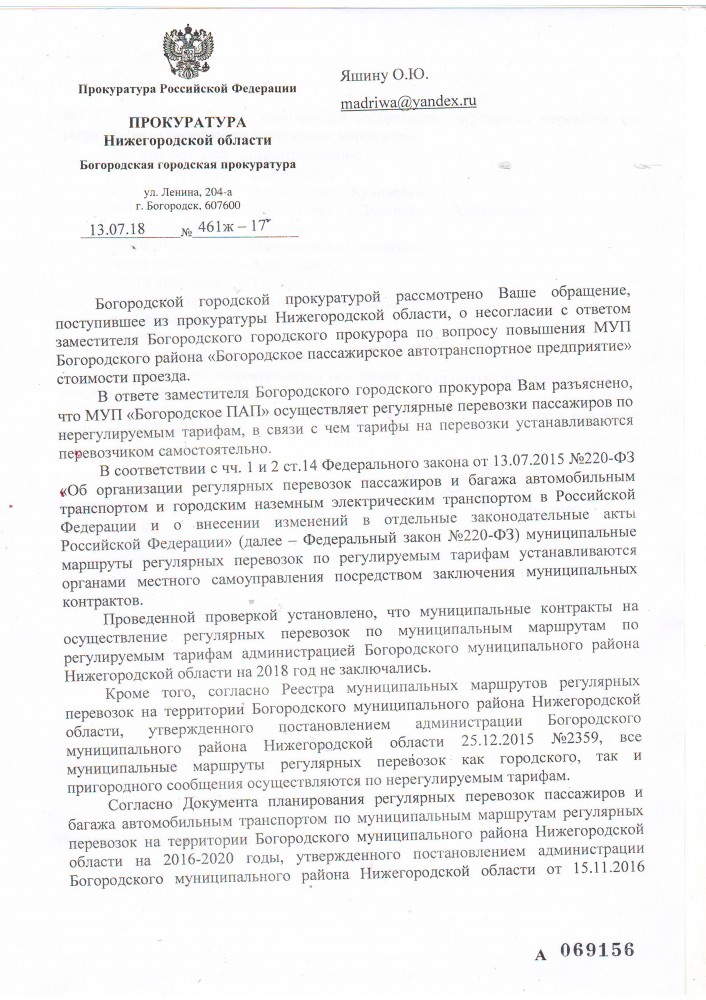 Я, Яшин Олег Юрьевич, город Богородск Нижегородская область. Прошу Вас провести проверку законности повышения тарифа на проезд пассажиров с 3 июня 2018 года, согласно законодательства РФ. В целях снижения убыточности перевозок внутримуниципальных маршрутов МУП «Богородское ПАП» с 3 июня 2018 г. устанавливает следующие тарифы на проезд пассажиров и провоз багажа в автобусах на пригородных внутримуниципальных маршрутах регулярного сообщения: в автобусах, работающих в социальном режиме – 2,80 руб. за пассажиро-километр. Минимальная плата за проезд в автобусах пригородных межмуниципальных маршрутов составит – 25 руб. Стоимость одной поездки в городских автобусах составит – 25 руб