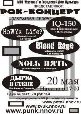 - Nolь пять (provincial – punk) – коллектив переживает не лучшие времена…. Хотя, с какой стороны посмотреть… Дело в том, что в составе команды грядут некоторые изменения, а именно Ильич уходит из группы…. Очень жаль терять талантливого музыканта, тем более, что он уже стал частью нас, частью нашей семьи….Но это жизнь и тут ничего не поделаешь, каждому свое, как говориться…. На этом концерте Ильич еще с нами, а потом непонятно…. Впрочем, он всегда будет с нами, он наш друг, так или иначе…. А группа будет жить! Возможно совсем по-другому, возможно уже не так, как раньше, но, тем не менее, мы не собираемся сдаваться…. Мы еще Вас удивим! А 20 мая все как всегда – будем взрывать зал… ВСЕ ВМЕСТЕ!!! По старому…