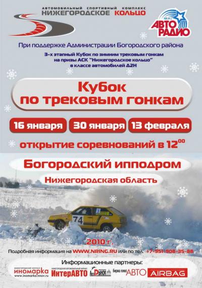 13 февраля на Богородском ипподроме при поддержке Администрации Богородского района и "Авторадио" состоится 3-й финальный этап Кубка по трековым гонкам в классе автомобилей Д2Н на призы АСК "Нижегородское кольцо".