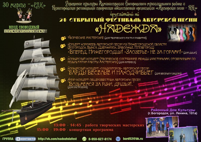 30 марта в богородском РДК пройдет 24 фестиваль авторской песни "Надежда-2013". В рамках фестиваля состоится конкурсный концерт, сборный концерт признанных мастеров авторской песни из Богородска, Выксы, Дзержинска, Заволжья, Н.Новгорода, юмористический концерт "Барды веселые и находчивые", будут работать творческие мастерские корифеев авторской песни.