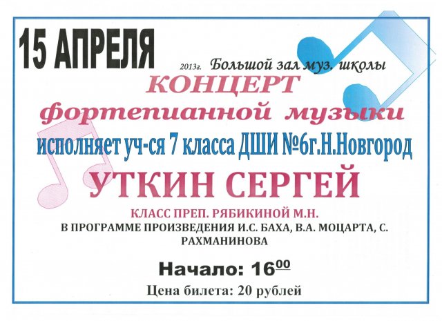 В исполнении учащегося 7 класса ДШИ № 6 города Нижний Новгород Сергея Уткина, прозвучат произведения И.С.Баха, В.А.Моцарта, С.Рахманинова. Преподаватель Рябикина М.Н.