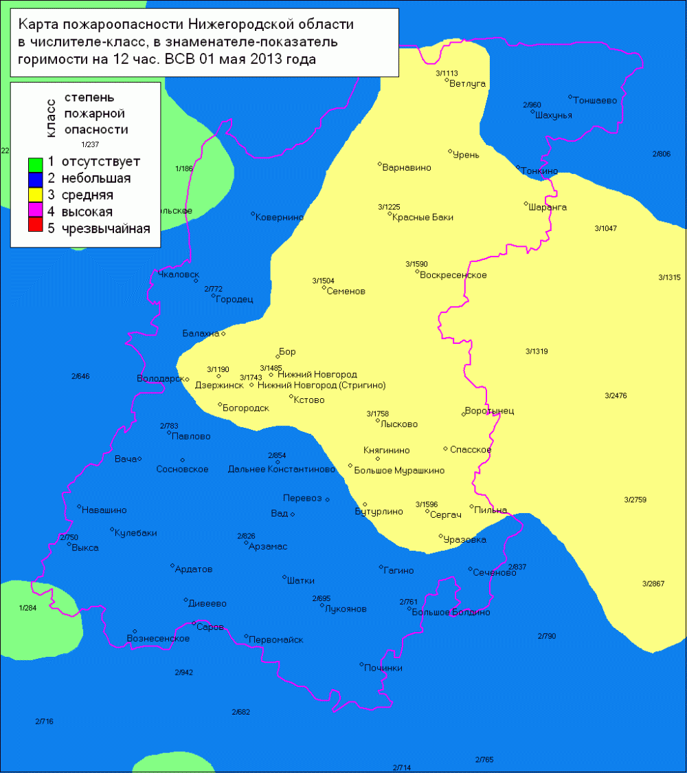 По данным ФГБУ "Верхне-Волжское УГМС", 1 мая 2013 года третий класс пожароопасности лесов установился в 26 муниципальных образованиях Нижегородской области: в городах: Бор, Нижнем Новгороде, Семенове, Дзержинске, Большемурашкинском, Бутурлинском, Балахнинском, Богородском, Воротынском, Воскресенском, Ветлужский, Варнавинский, Володарский, Гагинском, Кстовском, Княгининском, Краснооктябрьском,Краснобаковском, Лысковском, Пильнинском, Сергачском, Спасском, Сеченовском, Уренском, Тонкинском, Шарангском районах. В этих районах вводится запрет на посещение лесов.