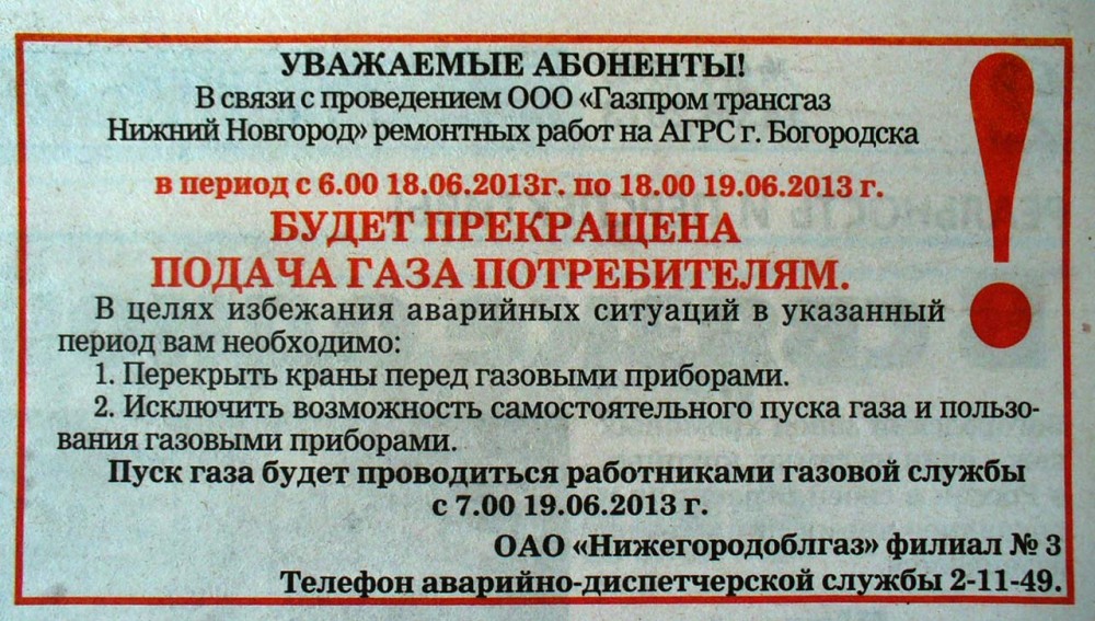 В связи с проведением ООО «Газпром трансгаз Нижний Новгород» ремонтных работ на АГРС Богородска в период с 06:00 18.06.2013 по 18:00 19.06.2013 будет прекращена подача газа потребителям.