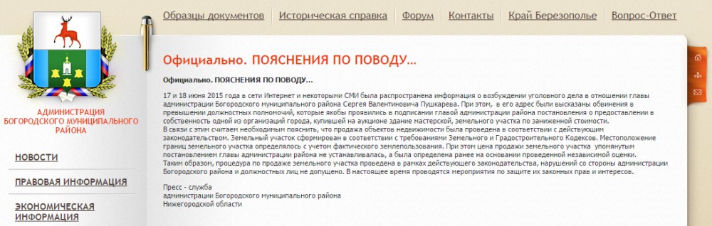По словам прокуратуры глава администрации района Сергей Пушкарев, зная, что площадь испрашиваемого участка существенно завышена, принял решение о представлении его в собственность фирмы по заниженной стоимости. Для этого, превысив свои полномочия, он вынес соответствующее постановление, в котором земля оценивалась в 500 тыс. рублей.