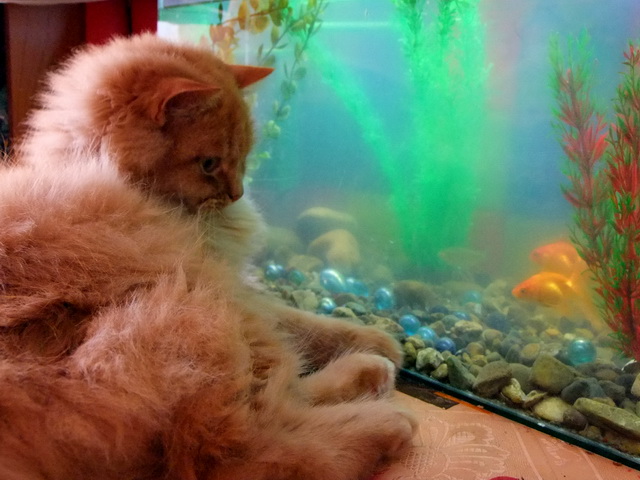 купили своему карасику парочку друзей-золотых рыбок. Впервые увидела какие они прожорливые
