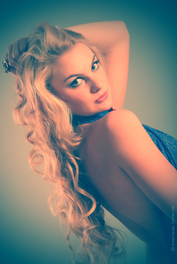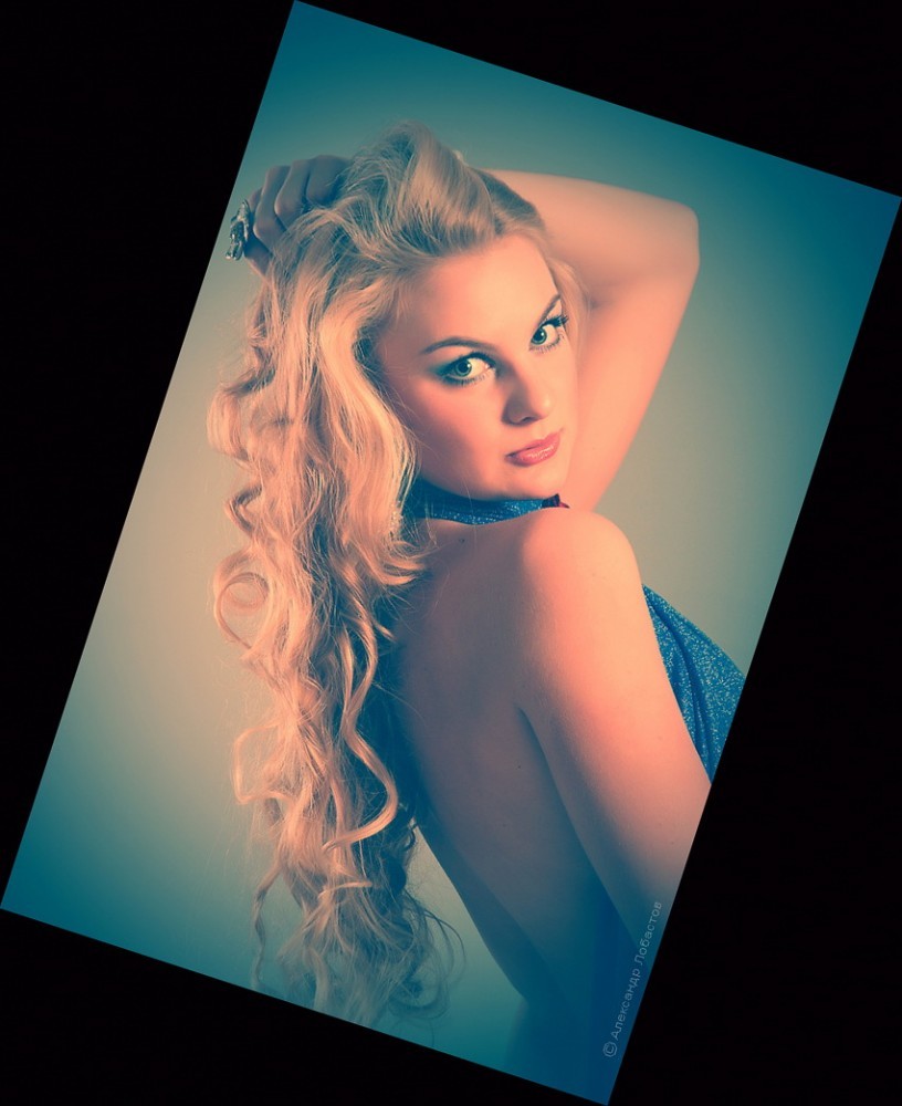 А что у нее с волосами: почему они прилипли к спине? При таком наклоне волосы должны были провисать вертикально. Эффект с цветным фильтром как опыт, как вариант интересен. А вот наклон - не уверен.