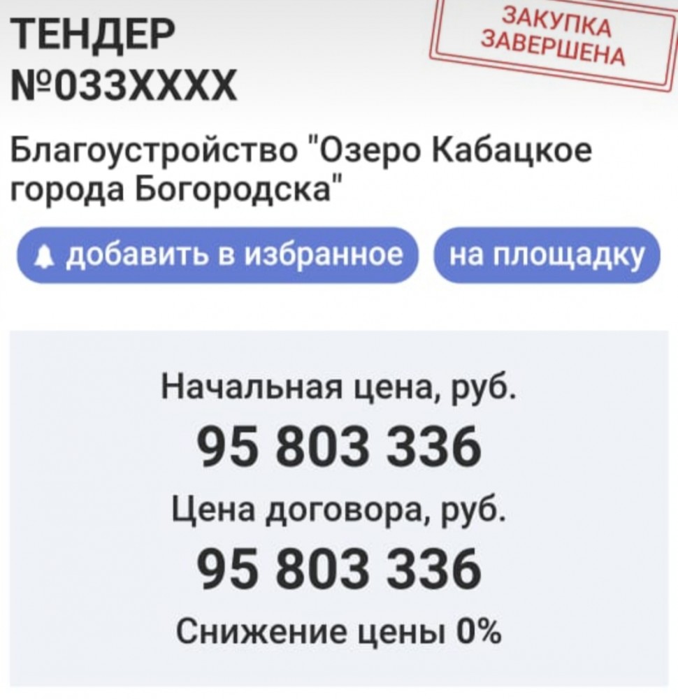 Меня интересует другое: почему из нескольких заявившихся подрядчиков оставили только одного, который и выиграл тендер без снижения стоимости. Остальных заявителей "слили" по неясным причинам, а их жалобы в ФАС были отклонены. Ну и даже на вскидку: объективные траты на проведённые работы в лучшем случае на половину стоимости тендера. Про качество говорить не приходится..."Где деньги, Зин?" (с)