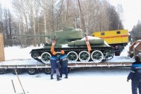 Для вывоза 36 тонного танка с территории машиностроительного завода приехала внушительная техника. Провожать «Т-34» вышли даже жители близлежащих домов.
