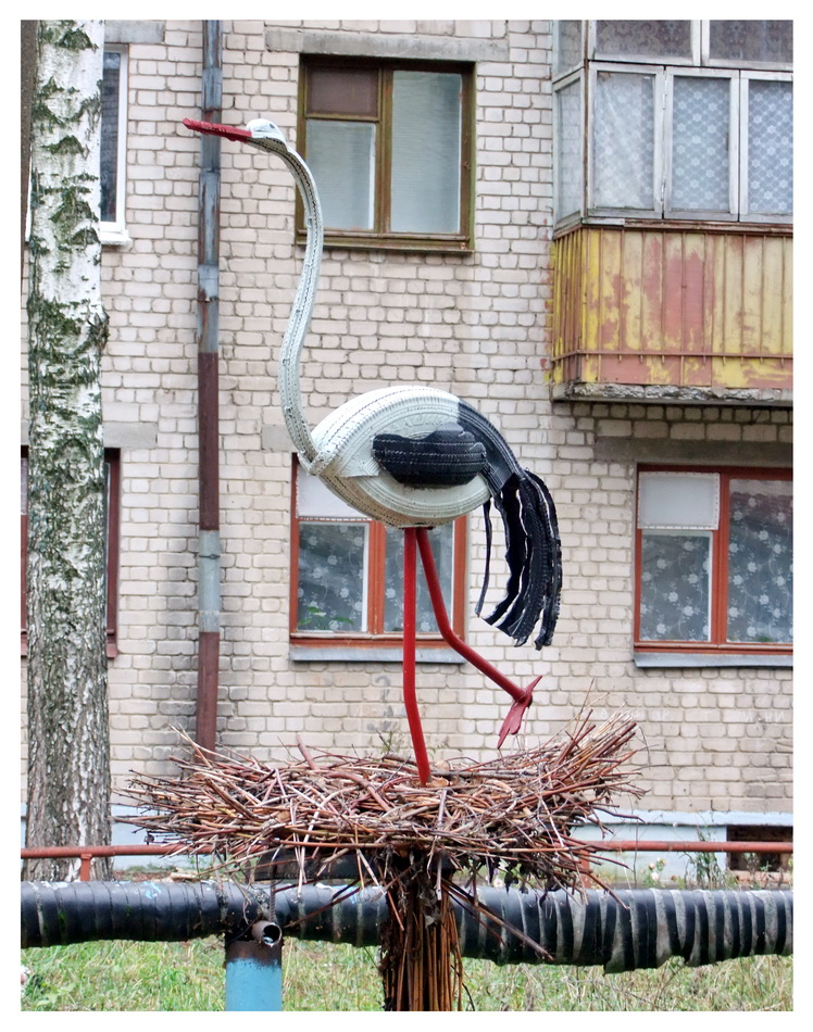 Здесь на фотографии просто аист, а летом у него в клюве еще была корзиночка, а в ней лежал игрушечный пупсик