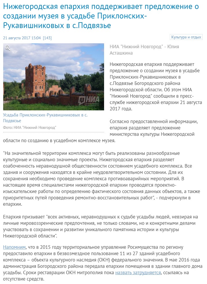 Не возьмет РПЦ этот объект. Архитектурно-художественная ценность сомнительна, как объект исторический он практически уничтожен. Будь там хоть фундамент какого-нибудь храма, была бы надежда, что Церковь заинтересуется, хотя бы ради привлекательного места: под соусом восстановления храма прихватила бы и лакомый кусок земли, может, в процессе обустройства и восстановила что-ни-то и из усадебных построек. А так не возьмется, её сейчас интересуют более хлебные места, где надо меньше вложений и светит более скорая отдача. ИМХО.