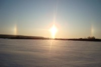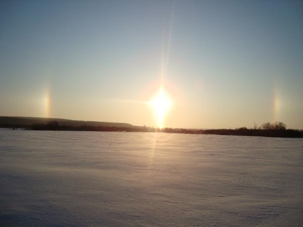 Тут на хабре проскочило обсуждение данного эффекта. Оказывается это явление называется "Паргелий" — одна из форм гало, при которой на небе наблюдается одно или несколько дополнительных изображений Солнца. Возникает вследствие преломления солнечного света в анизотропно ориентированных частичках льда, падающих в атмосфере. В прочем, об этом рассказывалSanded в комментариях к фотографии Александра.