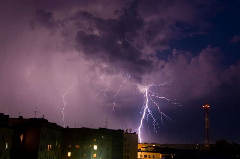 30 секунд выдержка,штатив,спусковой тросик. И нажимаешь без остановки! Вот почти час времени и жал! Страшно? Да нет,наоборот завораживает, тем более с балкона!