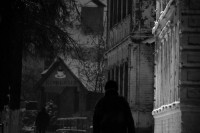 Ну так... Черное пятно -человек у киоска, на фоне белой метели.