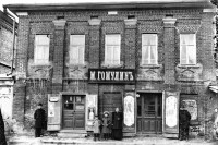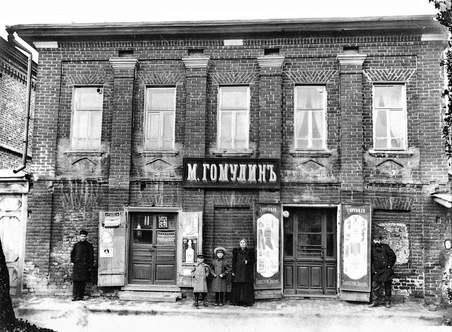 Первый этаж сдавался под магазин. Слева на снимке видна стена дома Головастиковых, в настоящем - расчетно-кассового центра. Это ориентировка для бывшего магазина М. Гомулина, здание которого сохранилось и по сей день (ул. Ленина, №187), но облицованное декоративным кирпичом и обшитое сайдингом потеряло свой исторический облик. Снимок отпечатан с негатива богородского фотографа Дмитрия Матвеевича Лапкина и реставрирован.
