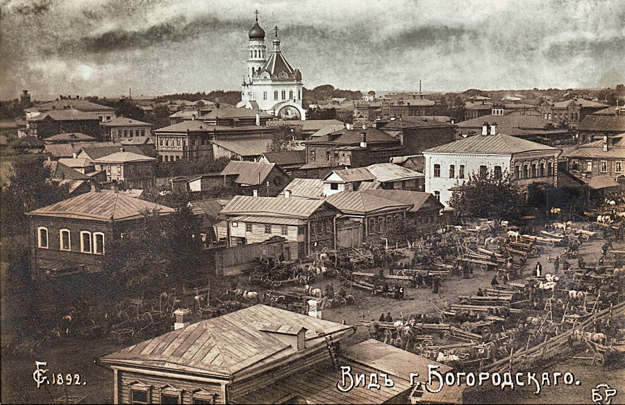 1892 - не дата фотографии. Скорее всего это год, когда братья Серяковых, открытка напечатана ими, организовали свое дело. На снимке нетрудно разглядеть дома, построенные в начале двадцатого века. Кроме того, Богородское названо городом, поэтому вполне возможно, что снимок сделан не ранее 1923 года: ярмарки тогда еще проходили, и храмы не были разрушены.