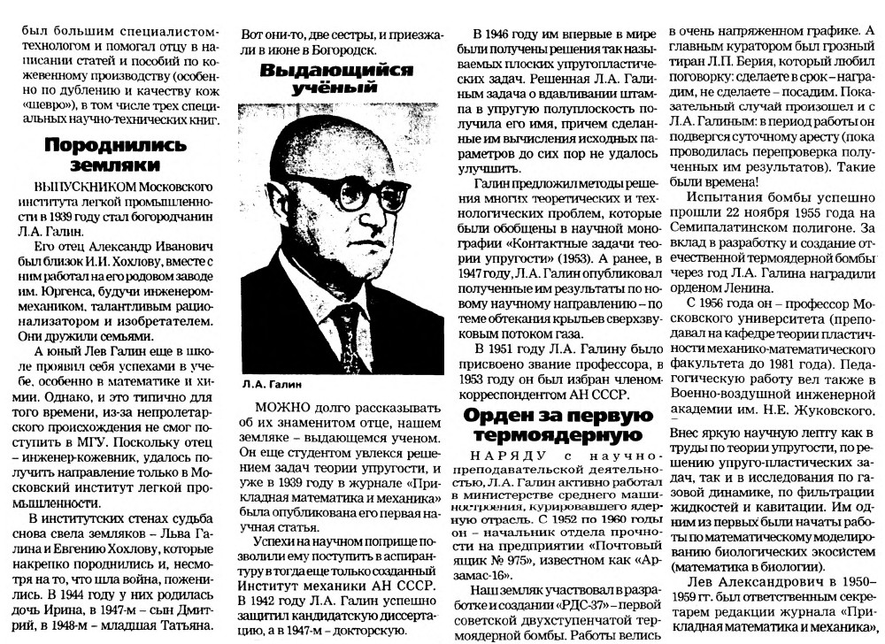 Публикация Д. Сургутова в Богородской газете. В статье упоминаются фамилии Галин, Хохлов, Равкинд, Шуваев