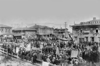 Увы, года не знаю. Не ранее 1923, раз на транспаранте СССР, а на улице весна.