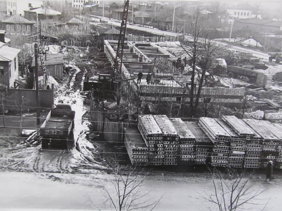Угол съёмки...Я так прикинул—снято с окна или крыши Искожа? По углу съёмки не похоже на балкон или окно соседнего дома(124)? 124,наверное,появился позднее на месте 2-этажного домика слева от стройки на фото.