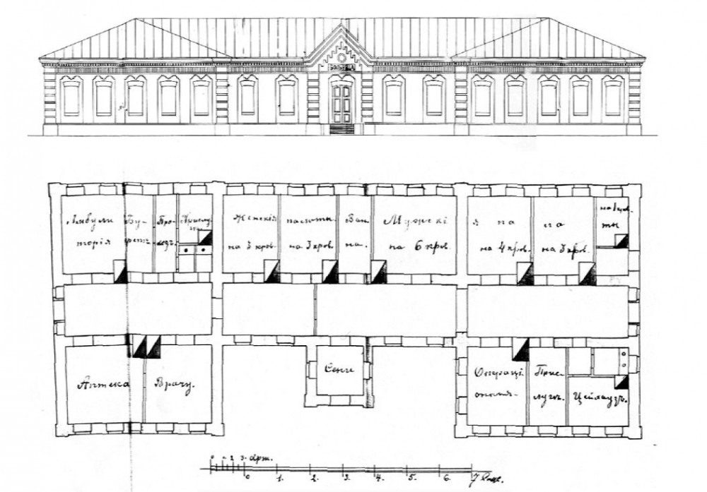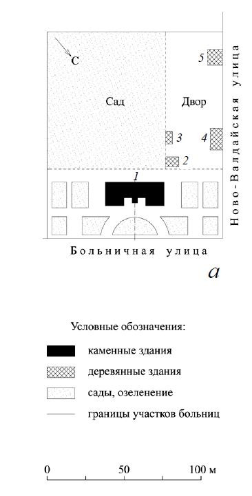 родском: 1 – здание больницы; 2 – кухня; 3 – ледник; 4 – сарай; 5 – баня;