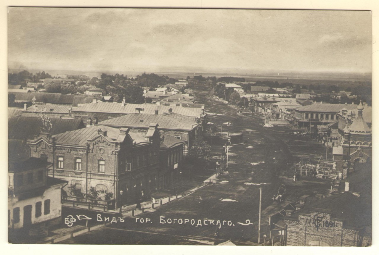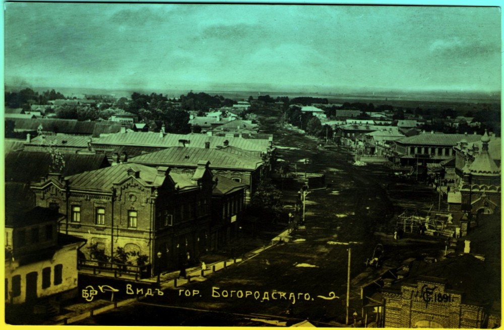 На фото - центр села Богородское. Здесь Богородское почему-то названо городом. Видимо, это фото сделано после 1923 года, хотя справа указана дата - 1891. Поскольку некоторые дома (например, В.Головастикова) были построены в начале 20 века.